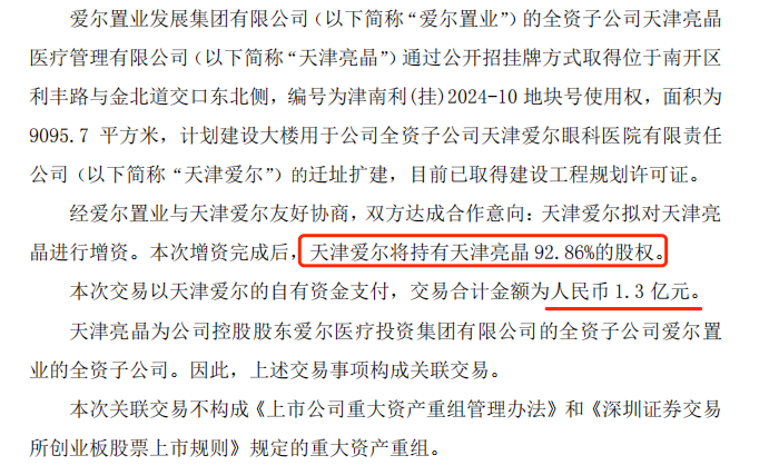 3月24日,爱尔眼科(300015)发布公告称,其全资子公司天津爱尔眼科医院有限公司(下称“天津爱尔”)计划向天津亮晶医疗管理有限公司(下称“天津亮晶”)增资1.3亿元人民币。
