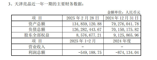 《财中社》注意到,天津亮晶2024年亏损87万元,资产总额7927万元、负债总额7015万元,股东全部权益为912万元。